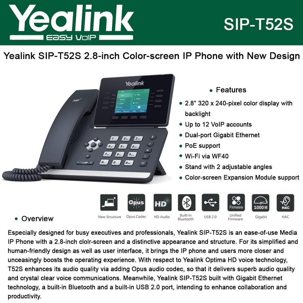 Especially designed for busy executives and professionals, Yealink SIP-T52S is an ease-of-use Media IP Phone with a 2.8-inch clolr-screen and a distinctive appearance and structure. For its simplified and human-friendly design as well as user interface, it brings the IP phone and users more closer and unceasingly boosts the operating experience. With respect to Yealink Optima HD voice technology, T52S enhances its audio quality via adding Opus audio codec, so that it delivers superb audio quality and crystal clear voice communications. Meanwhile, Yealink SIP-T52S built with Gigabit Ethernet technology, a built-in Bluetooth and a built-in USB 2.0 port, intending to enhance collaboration and productivity.Yealink SIP-T52S is designed to satisfy the users who need for a higher cost-performance IP phone with the improvement of hardware, audio quality, user experience, collaboration efficiency, etc.