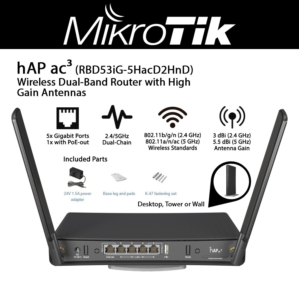 hAP ac³ Wireless Dual-band Router 5 Gigabit Ethernet Ports 716MHz CPU 256MB RAM